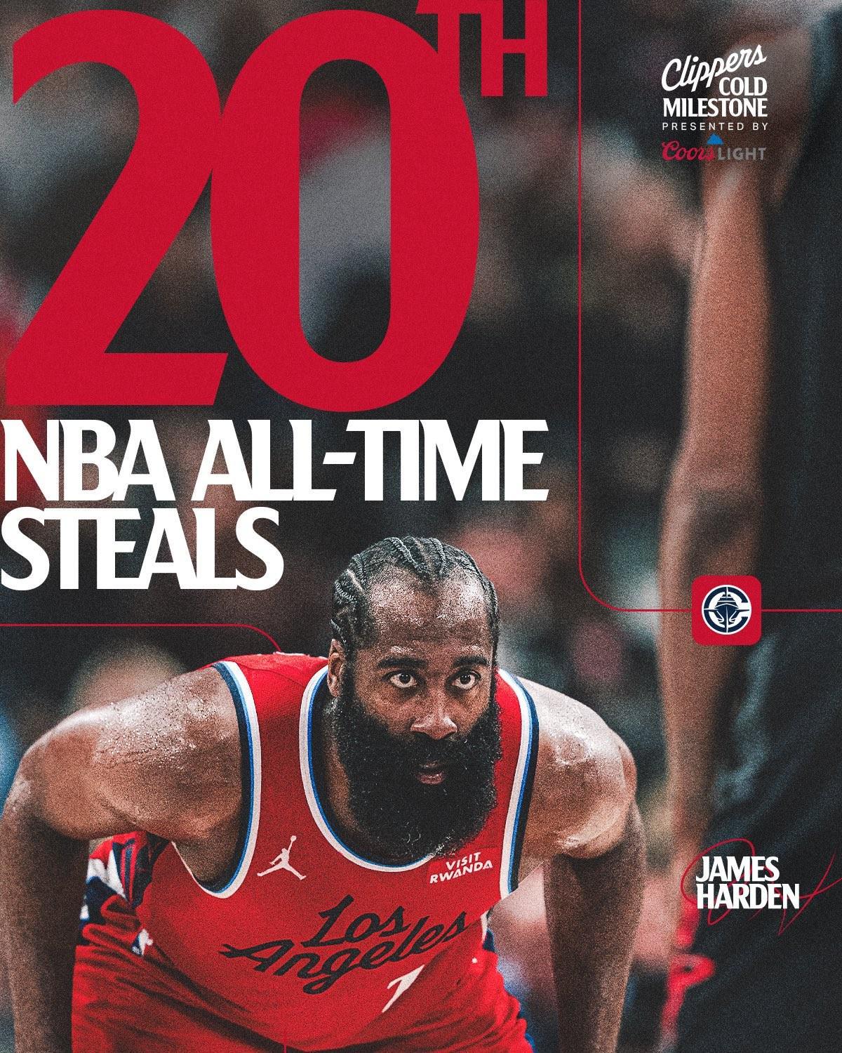 快船后卫哈登上半场完成2次抢断,至此,他在NBA历史抢断榜上超越伊戈达拉,排名历史第20。