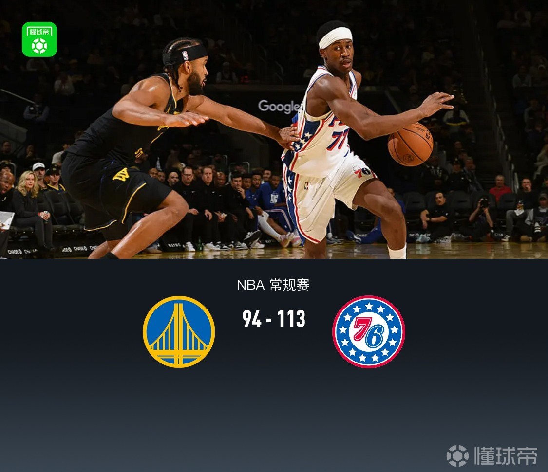 76人八人上双113-94勇士,埃奇库姆25+7+7,库里、恩比德均缺阵