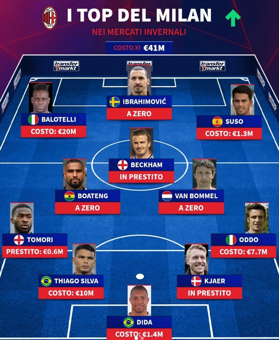 英超新闻北京时间1月18日,德转评选了AC米兰队史冬窗引援的最成功11人阵容,伊布拉希莫维奇、巴洛特利、贝克汉姆以及蒂亚戈-席尔瓦上榜。