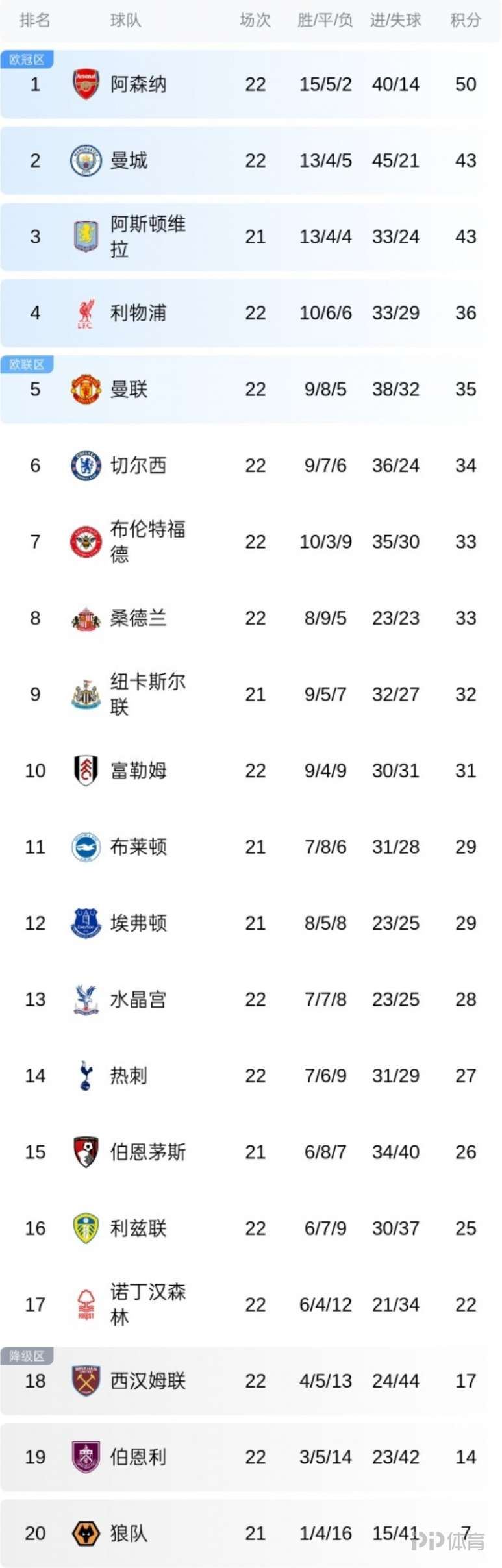 英超新闻英超第22轮的7场比赛已经结束,积分榜的形势出现新的变化。