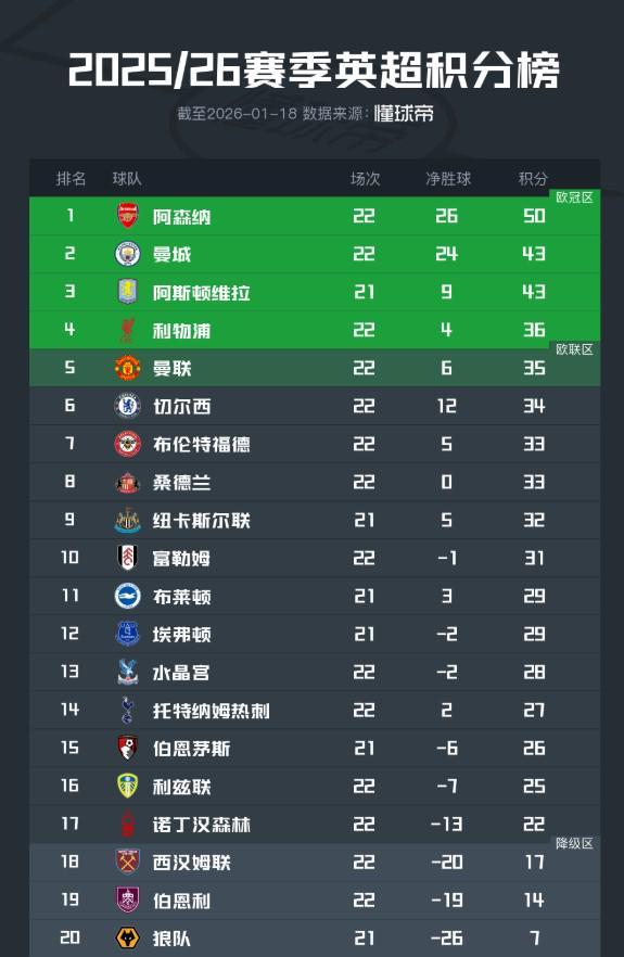 英超新闻北京时间1月18日,2025/26赛季英超联赛结束了第22轮的大部分较量,积分榜的形势也产生了进一步的变化。