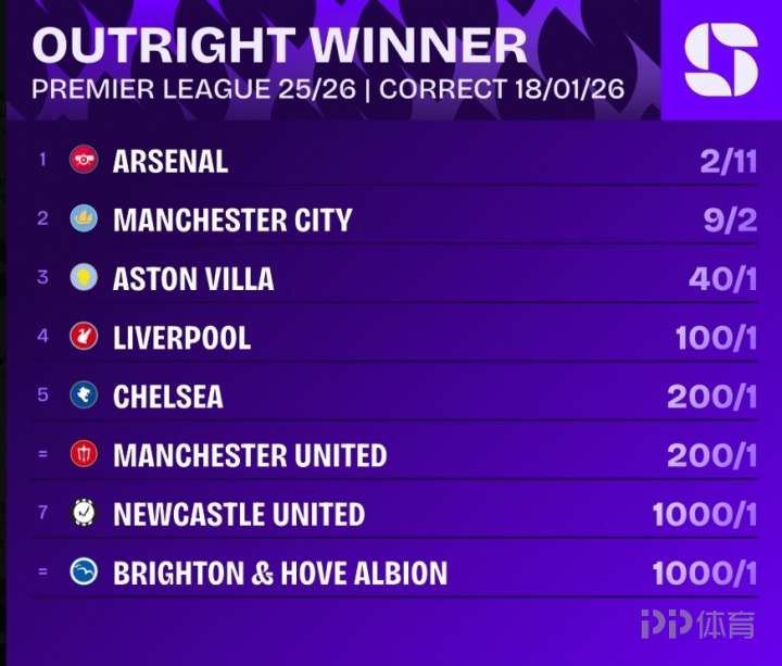 英超最新赔率:阿森纳断层领跑 曼城第2 维拉第3