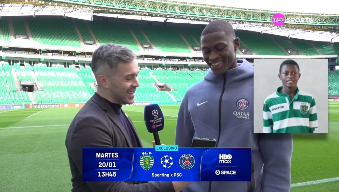 我们现在在葡萄牙里斯本的阿尔瓦拉德球场,和明天比赛的主角之一在一起。努诺-门德斯,很高兴采访你。我想先给你看一张照片,你曾经穿着这件球衣站在这里,这会给你带来怎样的感受?
