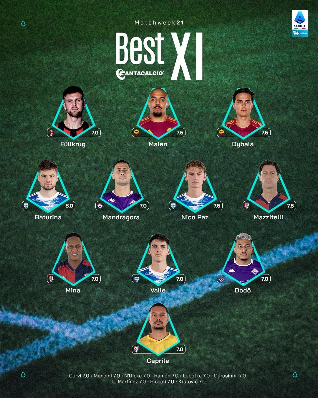 马齐泰利(卡利亚里)7.5分、尼科-帕斯(科莫)7.5分、曼德拉戈拉(卡佛罗伦萨)7.0分、巴图里纳(科莫)8.0分