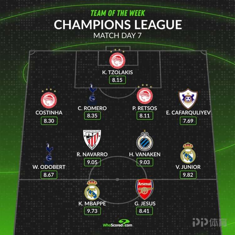 英超新闻欧冠联赛阶段第7轮比赛战罢,WhoScored列出了本轮最佳阵容,姆巴佩、维尼修斯、热苏斯在列。