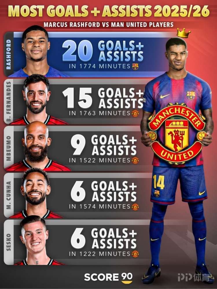 据Score90统计,拉什福德本赛季参与20粒进球,参与进球数量多于任何曼联球员。