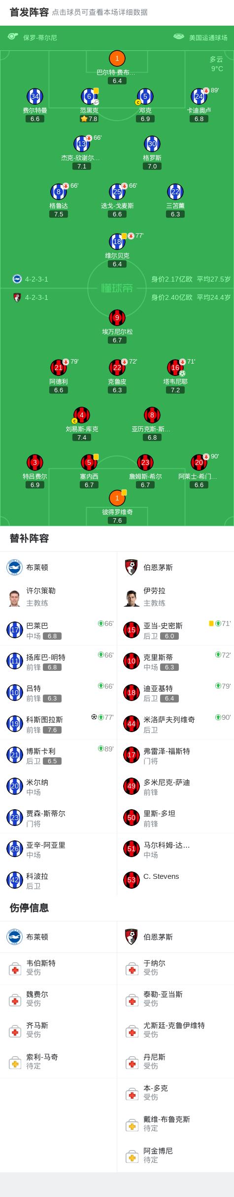 第33分钟,阿德利倒地,主裁改判点球,塔韦尼耶命中,伯恩茅斯1-0