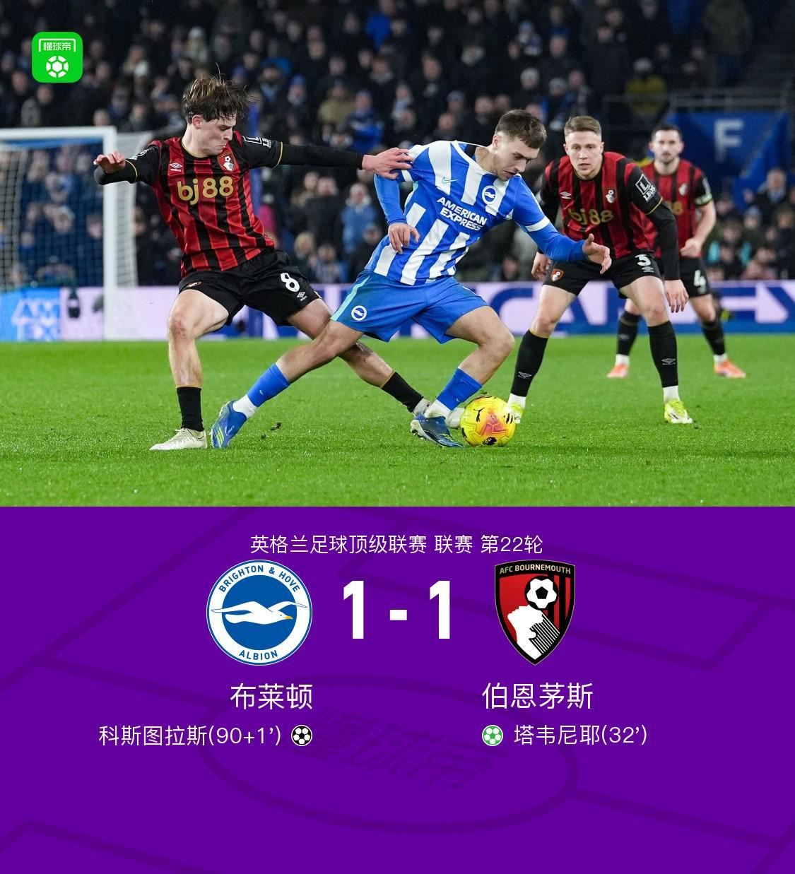 北京时间1月20日英格兰足球顶级联赛 联赛 第22轮,布莱顿主场对阵伯恩茅斯。上半场,阿德利造点,塔韦尼耶主罚命中。下半场最后时刻,范黑克助攻,科斯图拉斯倒钩绝平。全场比赛结束,布莱顿1-1伯恩茅斯。