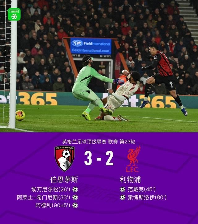 北京时间1月25日,英格兰足球超级联赛第23轮,伯恩茅斯主场对阵利物浦。上半场,范戴克失误后斯科特助攻埃万尼尔松破门,希尔助攻希门尼斯推射穿裆入网,索博斯洛伊助攻范戴克头球得手;下半场,萨拉赫助攻索博斯洛伊战术任意球破门,补时阶段阿德利上演绝杀。最终伯恩茅斯3–2战胜利物浦。