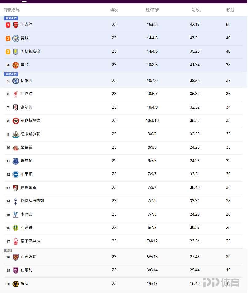 英超积分榜:阿森纳主场首败,领先优势变4分,曼联升至第四