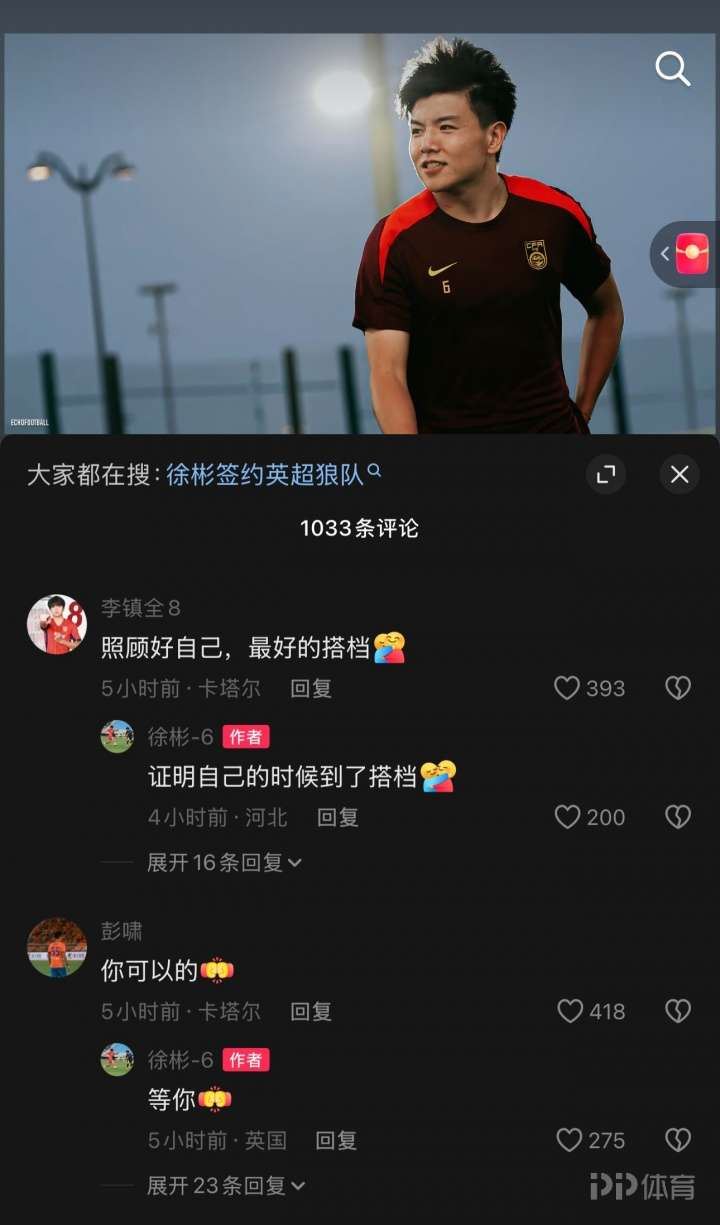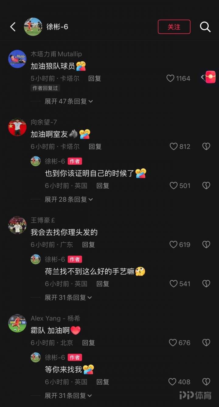 U23国足的队友们在评论区纷纷留言,包括木塔力甫、向余望、王博豪、杨希、李镇全、彭啸等人,其中木塔力甫评论“加油狼队球员”,徐彬一一回复,IP显示已在英国。