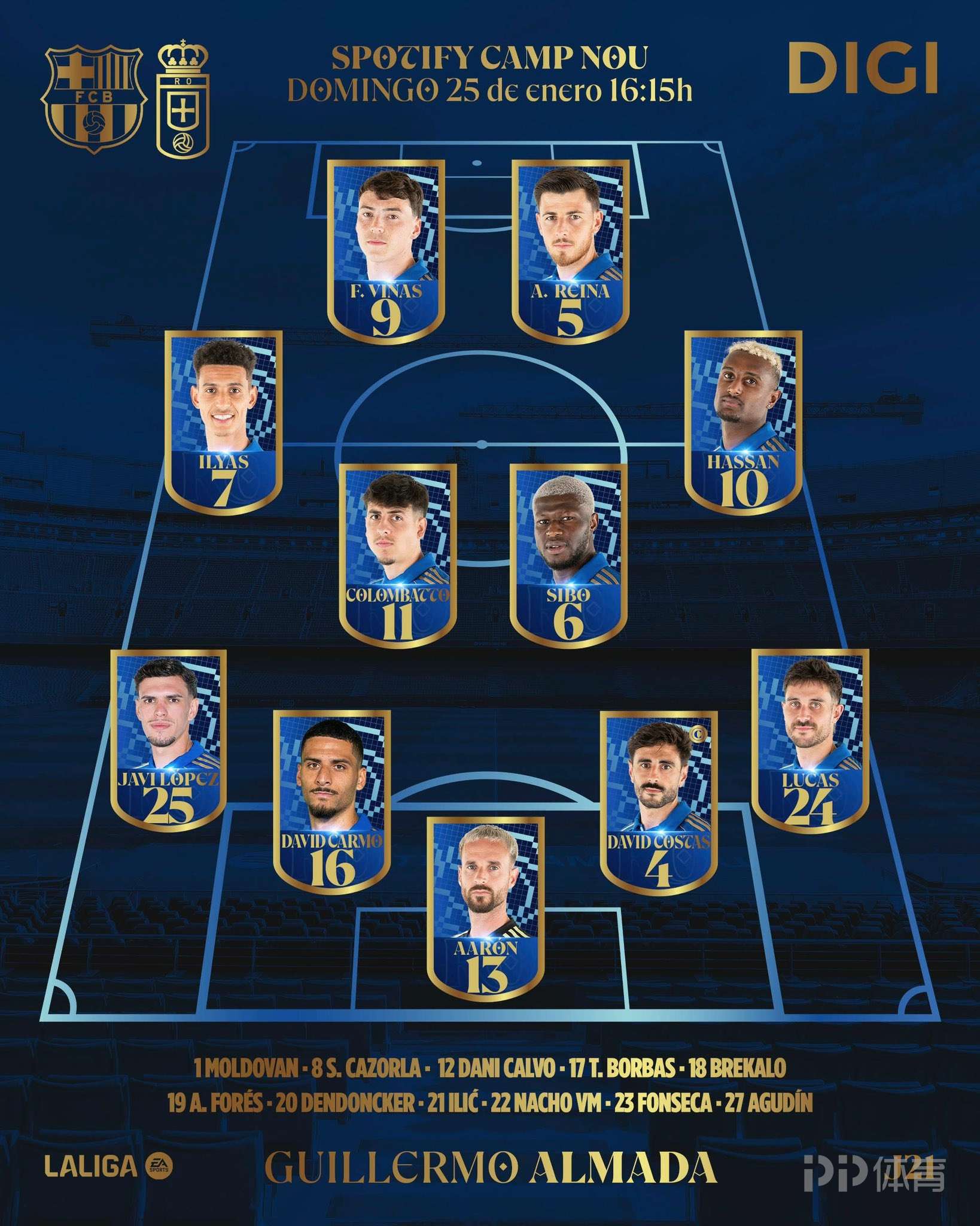 皇家奥维耶多首发:13-埃斯坎德尔、4-科斯塔斯、16-卡尔莫、24-阿伊哈多、25-哈维-洛佩斯、5-阿尔韦托-雷纳、6-西博、11-科伦巴托、7-沙伊拉、9-比尼亚斯、10-哈桑
