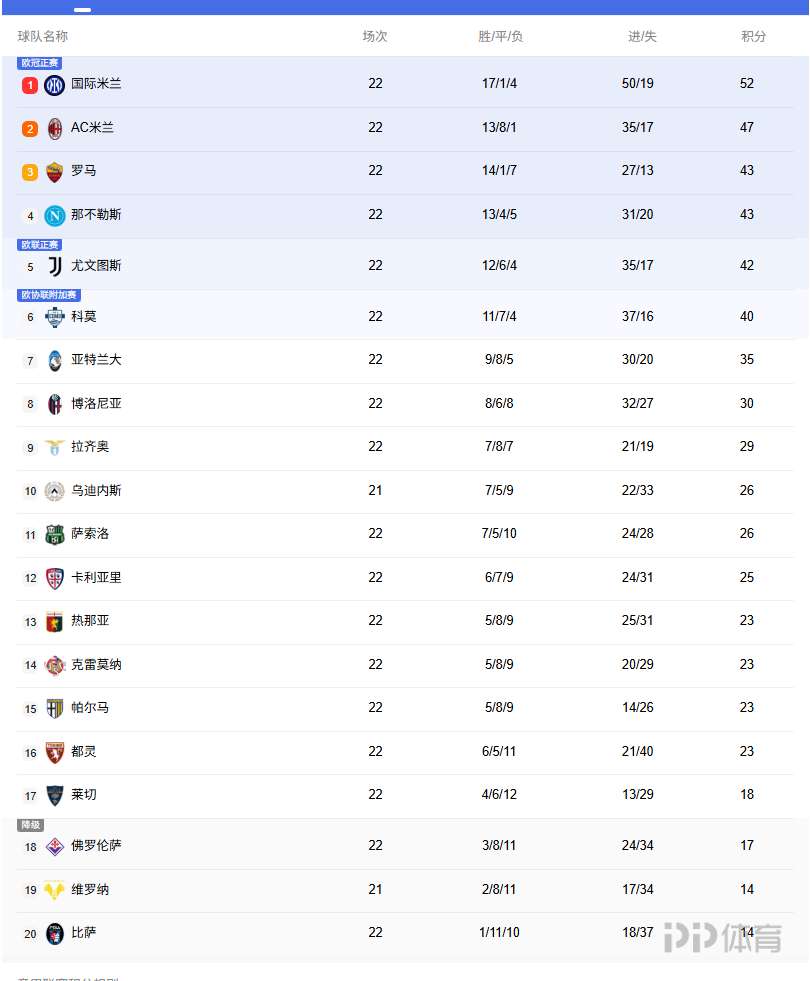 意甲积分榜:国米5分优势领跑!米兰仍第2 尤文距前四1分