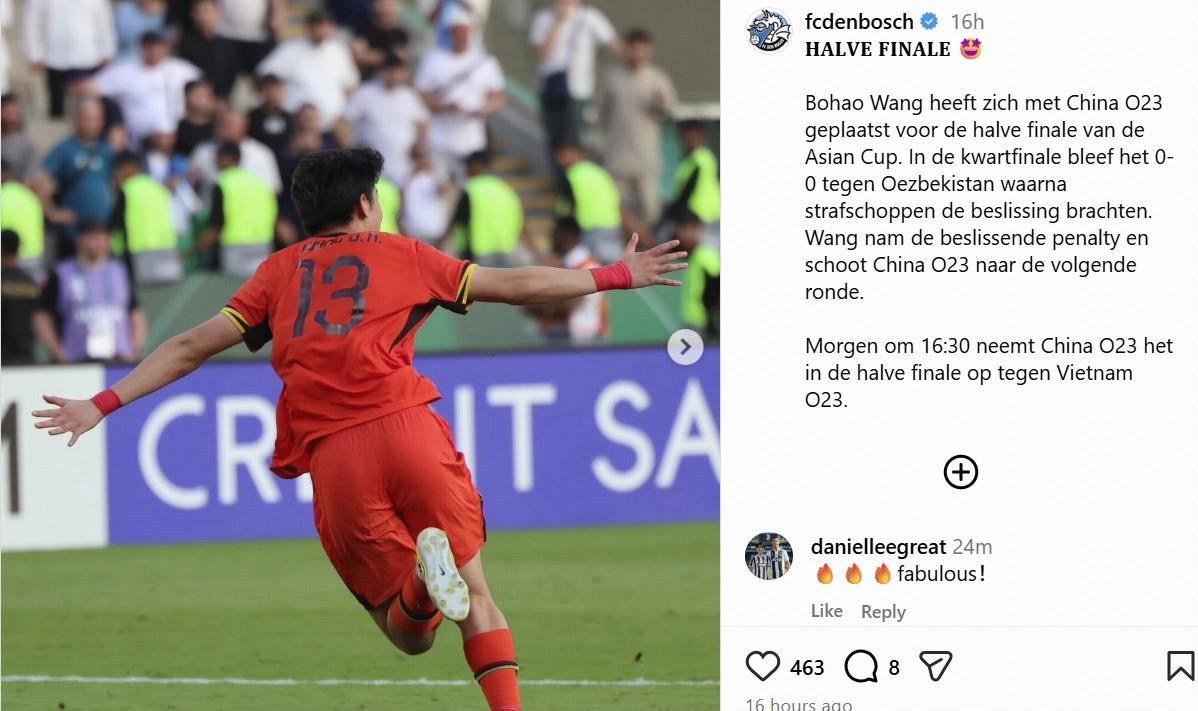 荷乙邓伯什祝贺王博豪:他在U23亚洲杯罚入决胜点球