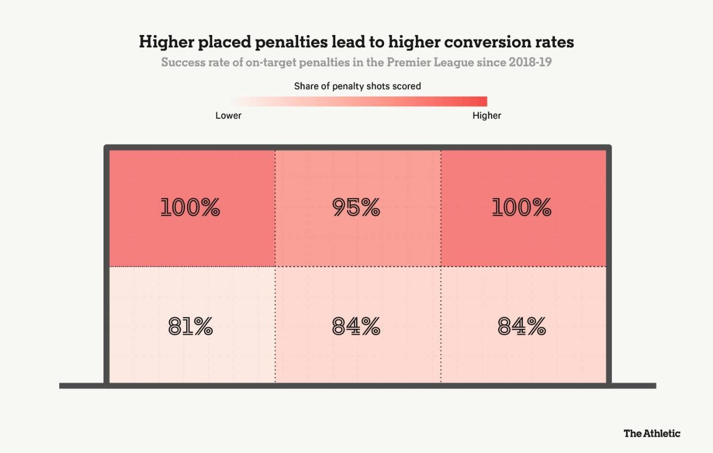 第二张图显示,点球踢得越高,进球的可能性就越大:显然,这其中存在一定的风险,因为如果踢得过高,就可能带来灾难,但如果你能准确地踢出一个轻巧的勺子点球,它应该会轻轻地飞入横梁下方。