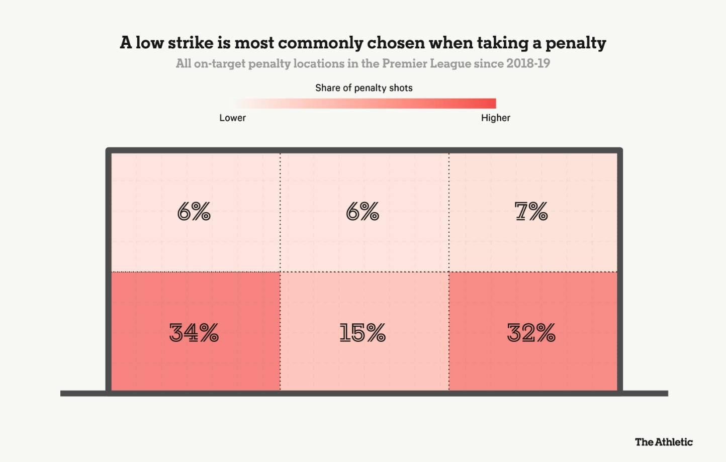 数据也证明了为什么这一选择是有道理的:上图显示了自2018-19赛季以来英超联赛中点球手最常选择的主罚方向:首先可以注意到,大多数点球都是朝两侧踢出的,因此门将理所当然会预计球会被踢向某个方向,并相应地做出扑救。