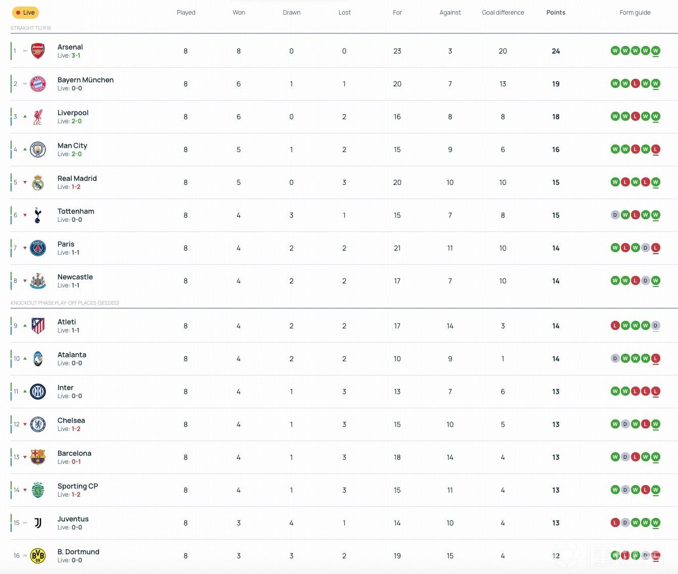 欧冠联赛阶段最后一轮18场同开,赛前6-13名的八支球队同积13分,对前八的直通名额展开了激烈争夺。不过半场过后,八支球队里仅曼城取得了领先。