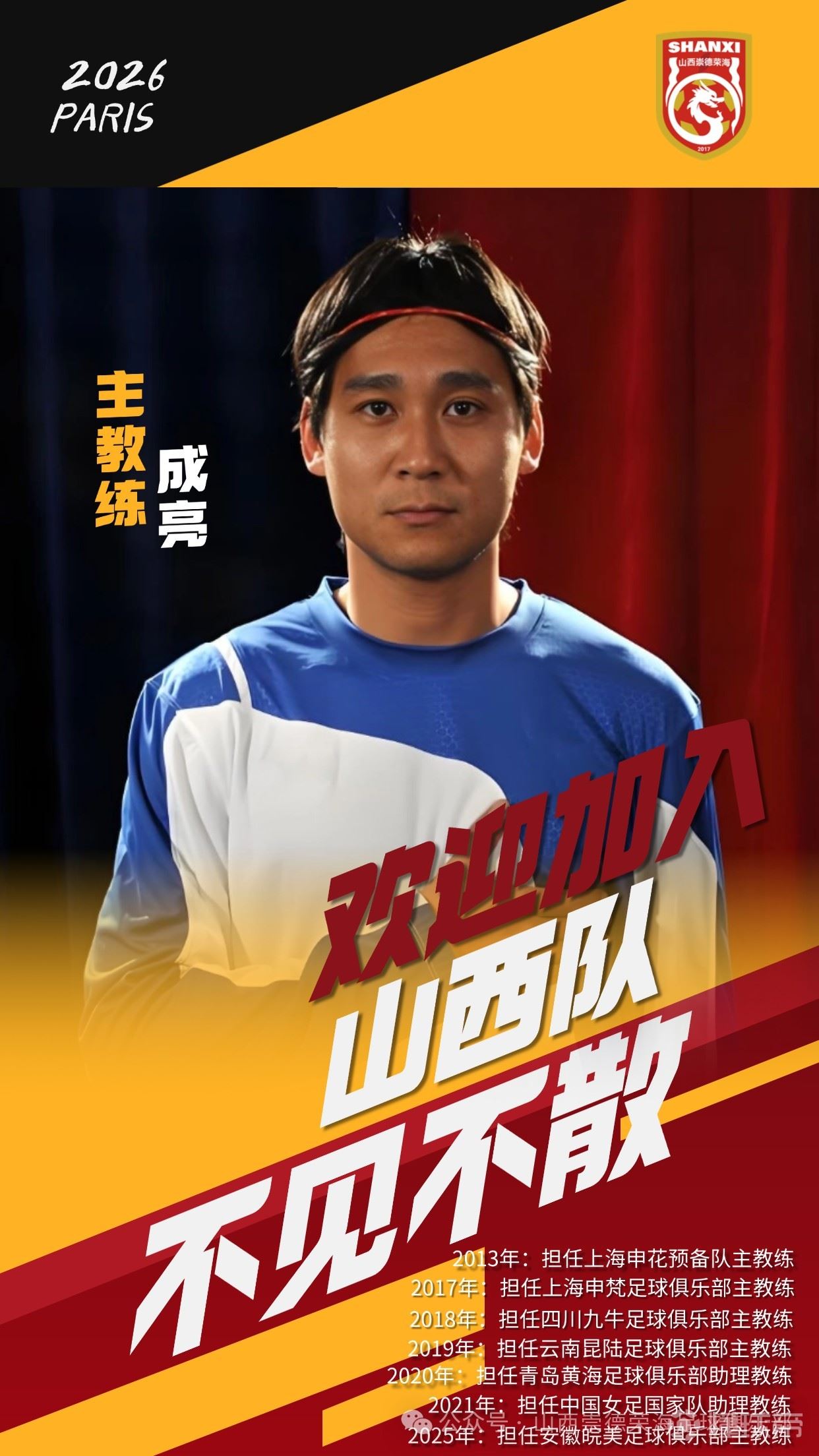 新援就位,聚力前行!经友好协商, 主教练成亮正式加盟山西崇德荣海足球俱乐部,新赛季将身披山西战袍,为家乡而战!新鲜血液注入,赛场活力升级,以拼搏之姿在新赛季的征程中并肩作战、共创佳绩!山西足球,未来可期!