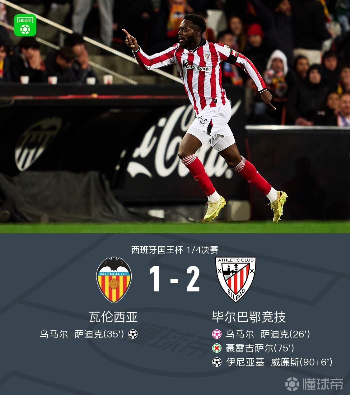 毕尔巴鄂2-1瓦伦西亚,晋级国王杯四强,伊尼亚基-威廉斯绝杀