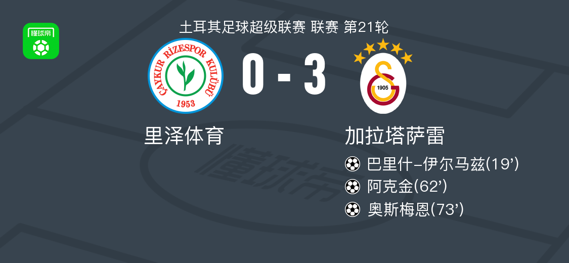 北京时间2月8日土耳其足球超级联赛 联赛 第21轮,里泽体育主场对阵加拉塔萨雷。加拉塔萨雷巴里什-伊尔马兹破门,阿克金破门,奥斯梅恩破门。最终比分里泽体育 0-3 加拉塔萨雷。