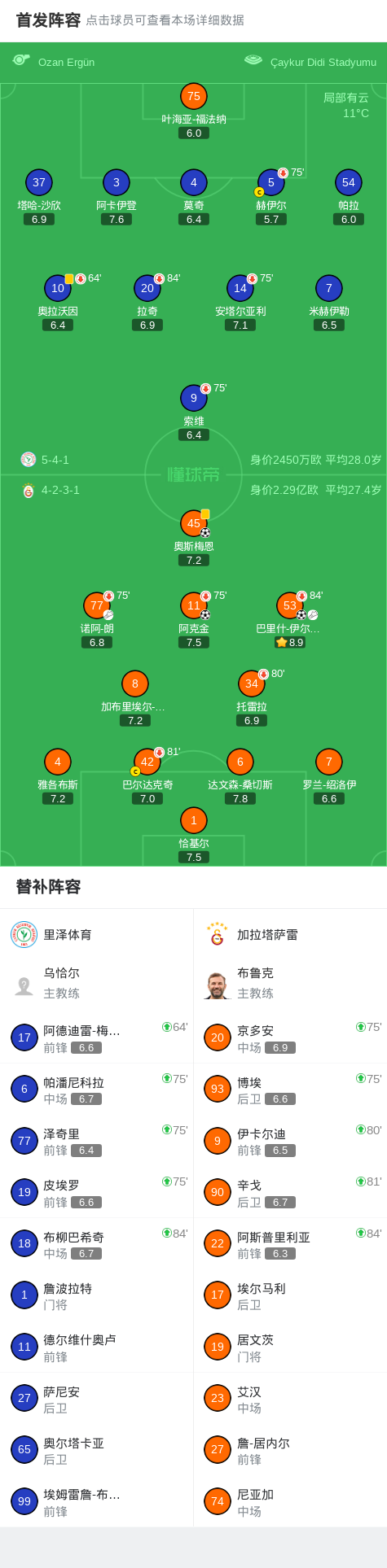 第19分钟,加拉塔萨雷球员诺阿-朗助攻巴里什-伊尔马兹打入一球。