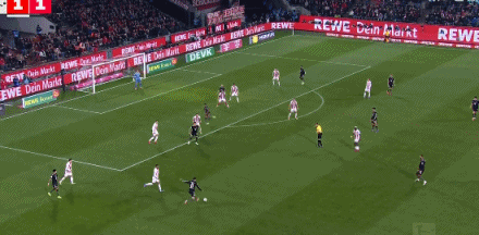 第41分钟,格纳布里失误被断,马伊纳带球反击远射破门!科隆1-0拜仁