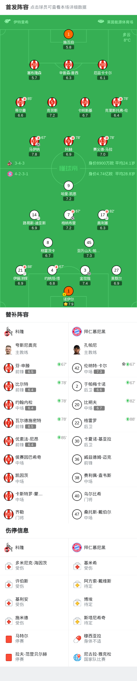 北京时间1月15日,德国足球甲级联赛第17轮展开较量,科隆坐镇主场迎战拜仁慕尼黑。上半场,格纳布里失误被断后马伊纳远射破门,奥利塞助攻格纳布里小角度破门扳平;下半场,伊藤洋辉助攻金玟哉头球入网完成反超,迪亚斯助攻卡尔低射破门。最终全场比赛结束,科隆以1比3不敌拜仁慕尼黑。